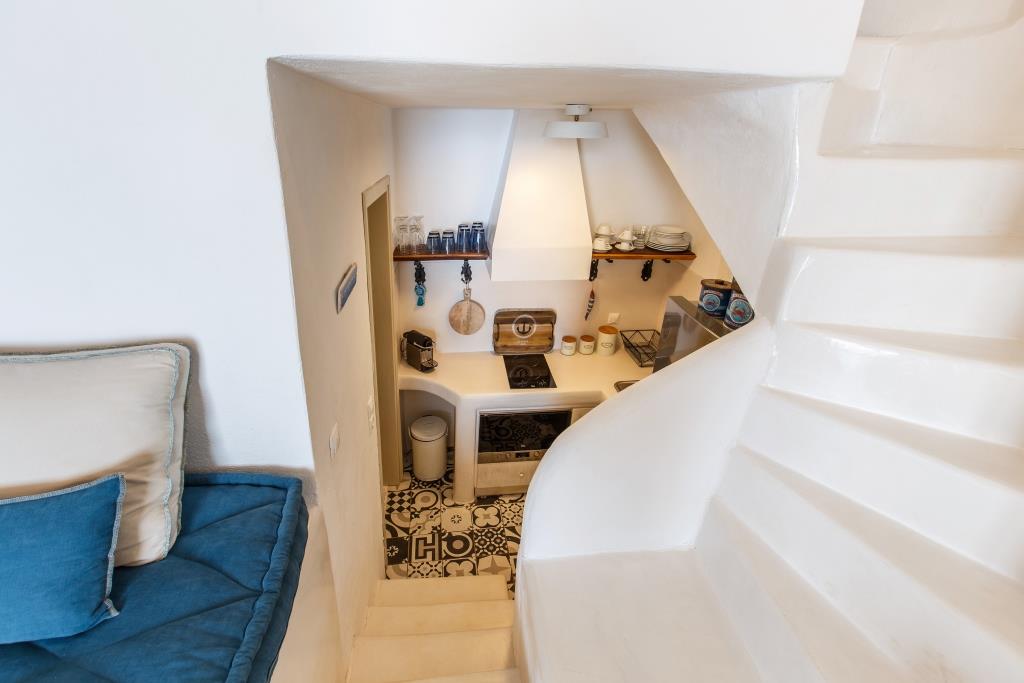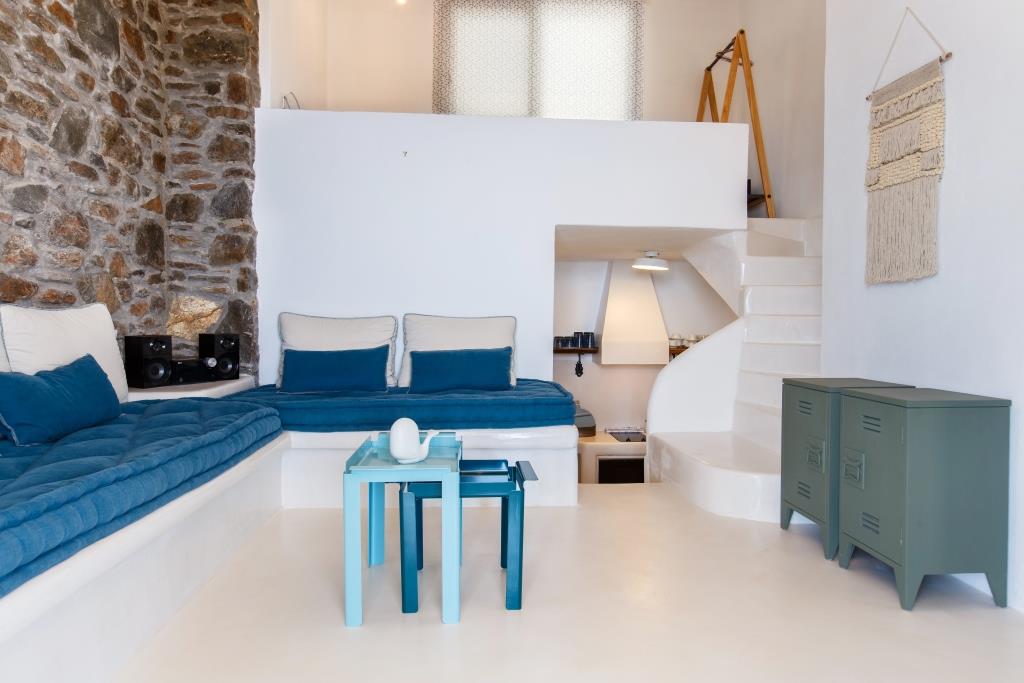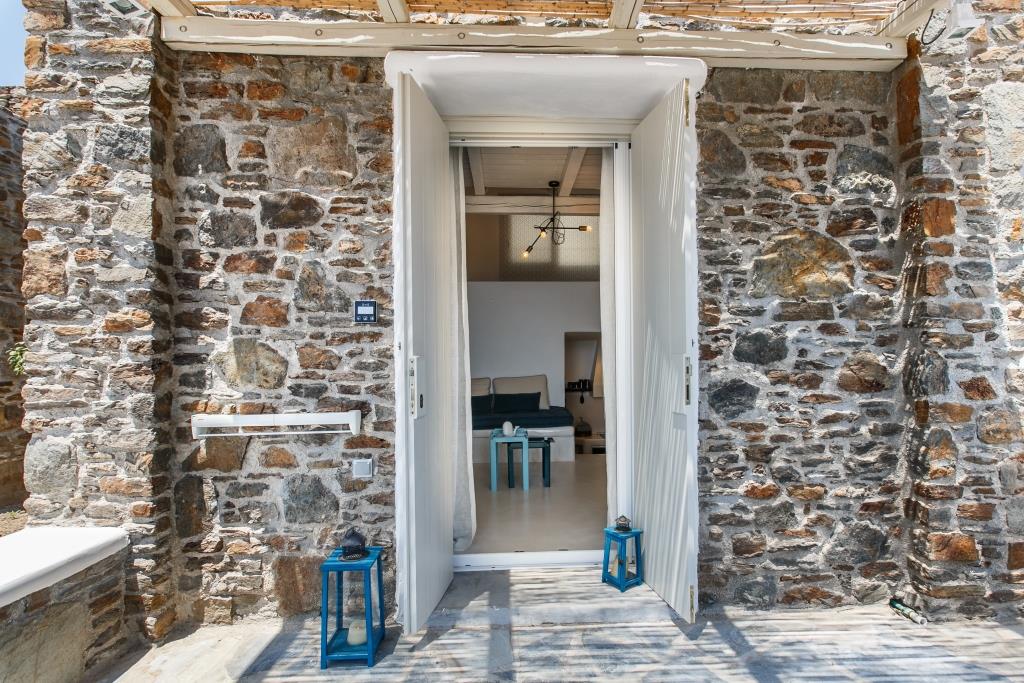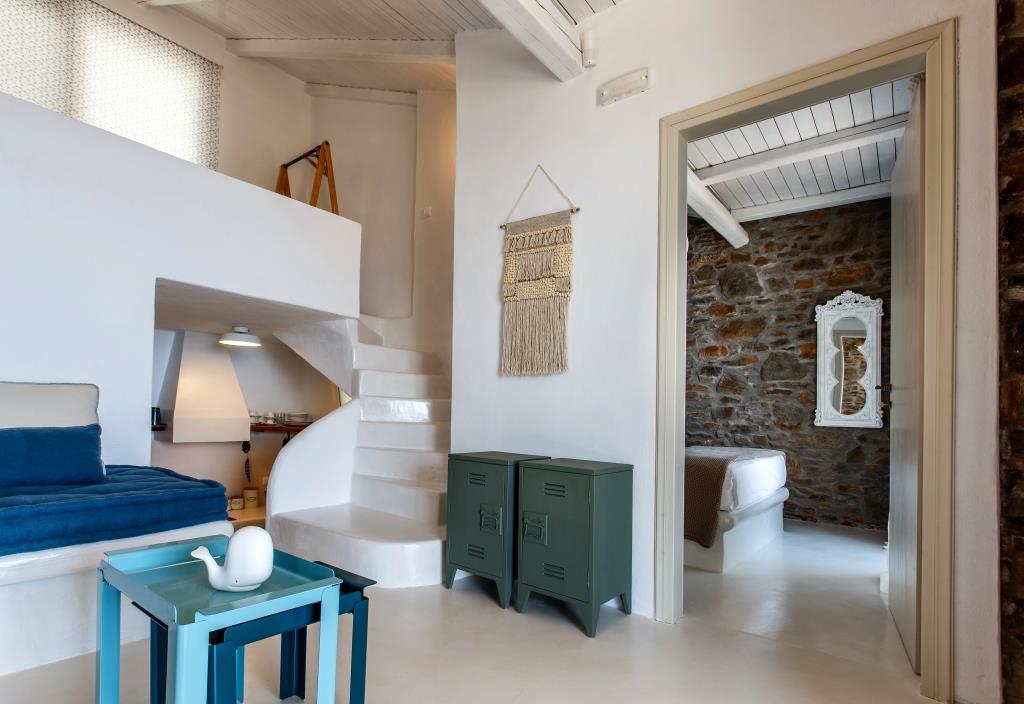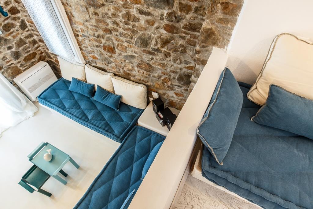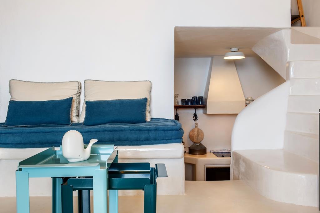 Sur la terrasse privée et meublée de la résidence, vous trouverez des chaises longues et une table pour profiter de la vue extraordinaire sur la mer Égée sous le soleil ou sous les mille étoiles de la nuit.