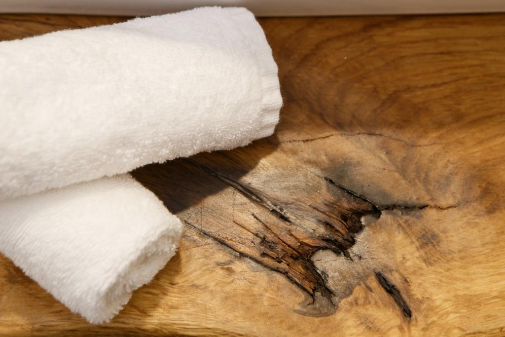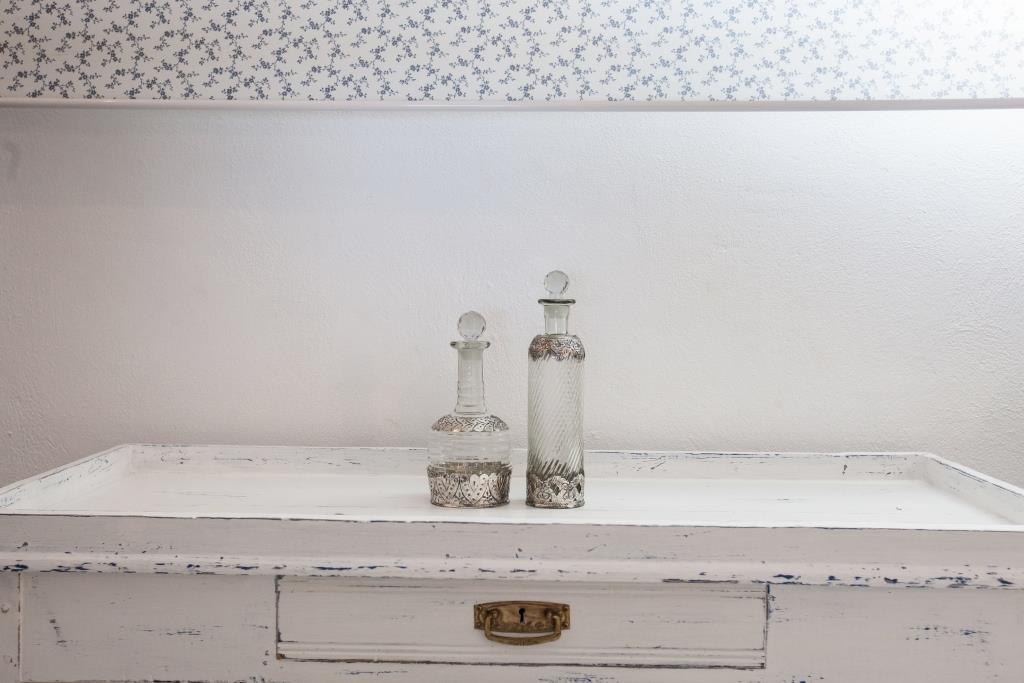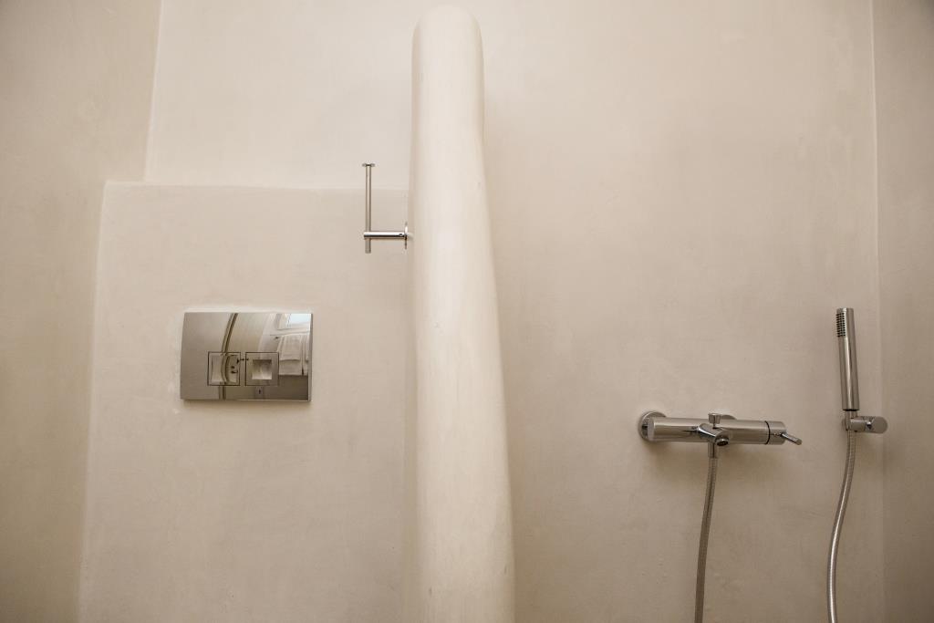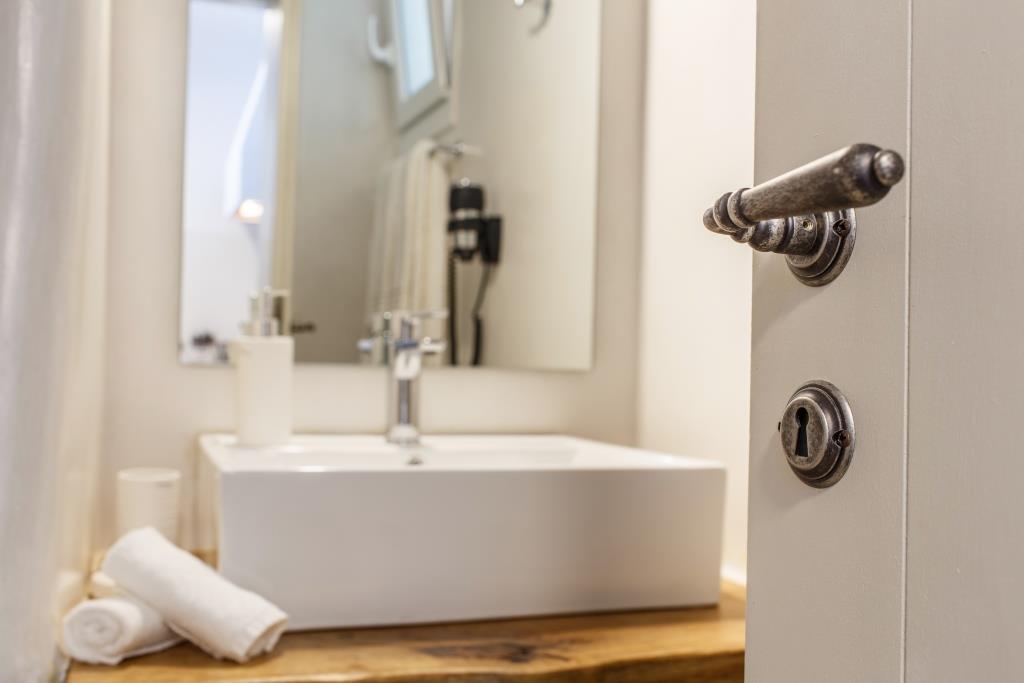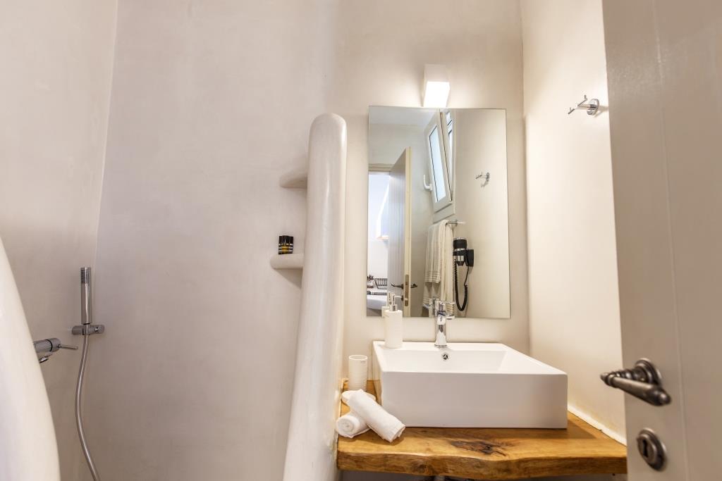 La salle de bain dispose d’une douche, d’un miroir, d’un sèche-cheveux et d’articles de toilette uniques de la firme grecque Apivita.