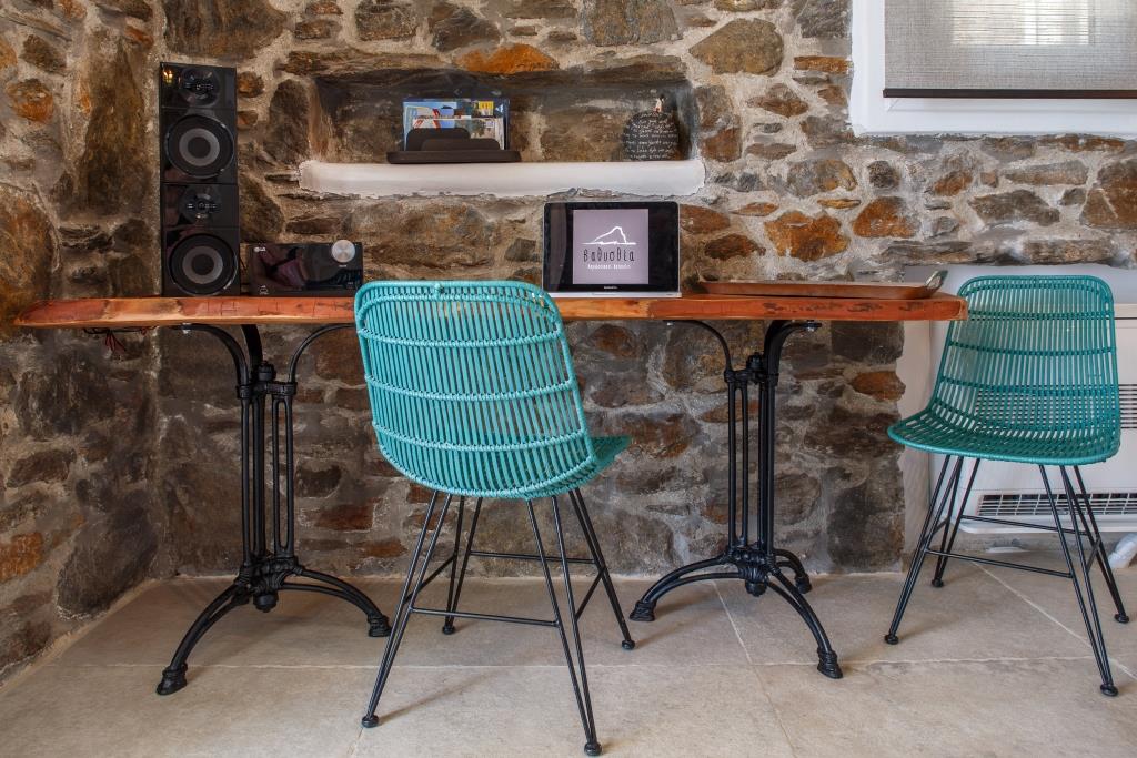 Το καθιστικό της κατοικίας περιλαμβάνει έναν μοναδικής αισθητικής χτιστό καναπέ με στρώμα της εταιρείας Cocomat επιλεγμένο ειδικά για να ταιριάζει με την διακόσμηση του σπιτιού, επίπεδη δορυφορική και επίγεια τηλεόραση, CD player – ραδιόφωνο και γραφείο.