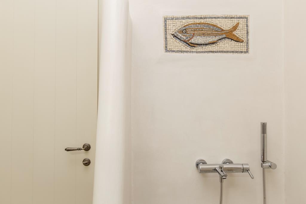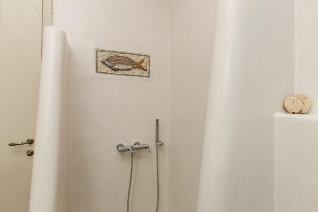 Το μπάνιο της κατοικίας είναι εξοπλισμένο με ντουζιέρα, καθρέφτη, σεσουάρ μαλλιών καθώς και με μοναδικά ελληνικά είδη καλλωπισμού της εταιρίας Ελληνικής εταιρείας Apivita.